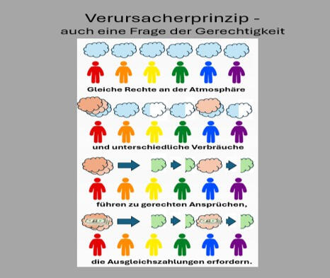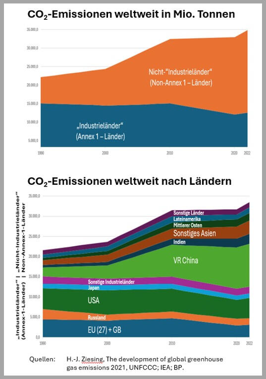 Die Industrieländer reduzieren ihre Emissionen, während die damals als "Nicht-Industrieländer" Bezeichneten die Emissionen steigern. Der Anteil an den globalen Emissionen liegt in Deutschland bei unter 2%, in den 27 EU-Ländern bei unter 8%.Dennoch war der Pro-Kopf-Ausstoß der Industrieländer über viele Jahrzehnte und ist bis heute wesentlich höher als im globalen Süden.
